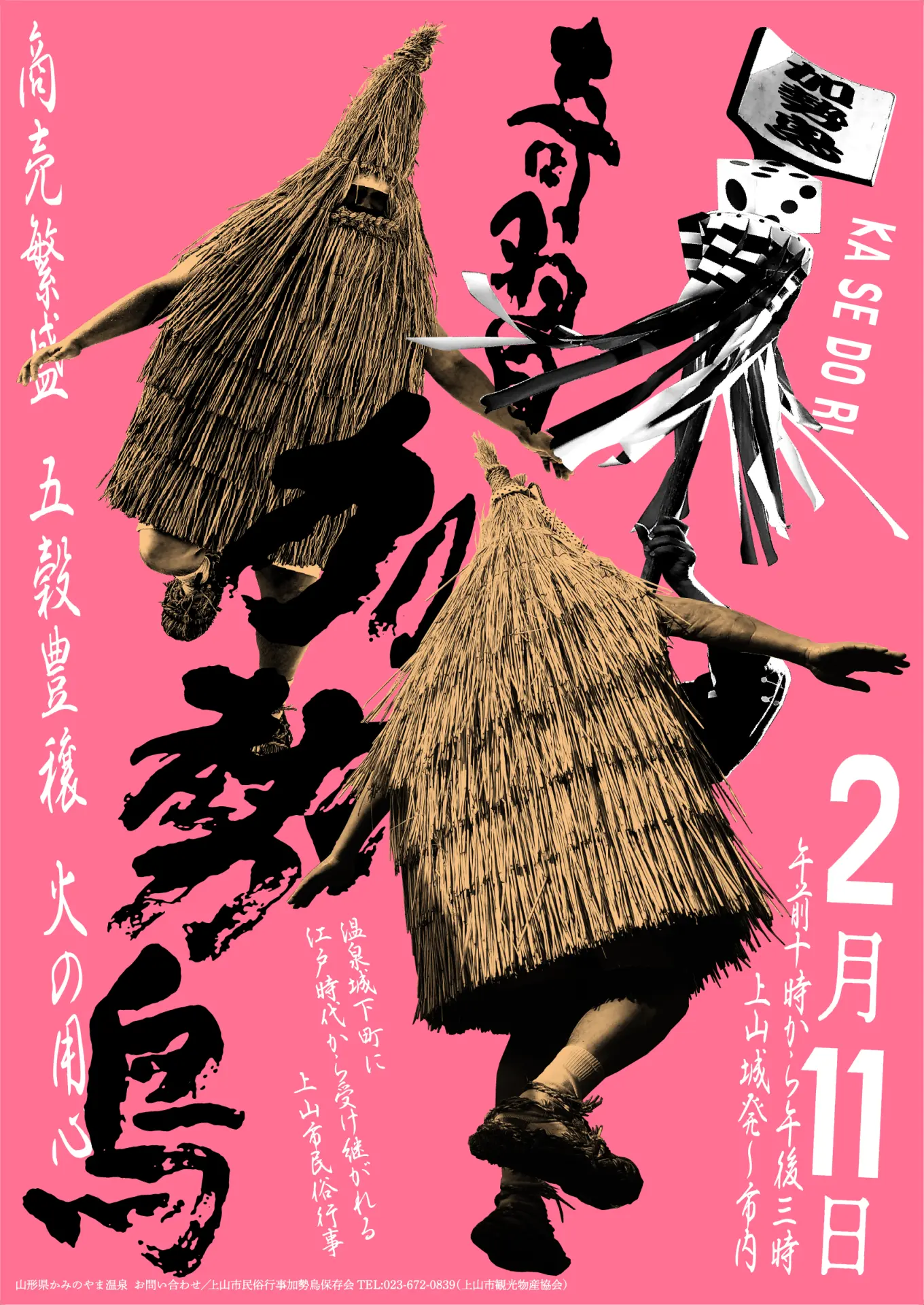 2/11(水・祝)上山市民俗行事 加勢鳥“ケンダイ”という藁蓑をかぶった若者に手桶から祝いの水をかけ、五穀豊穣や商売繁盛などを祈る、江戸時代初期から伝わる上山伝統の民俗行事です。